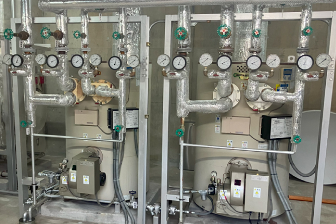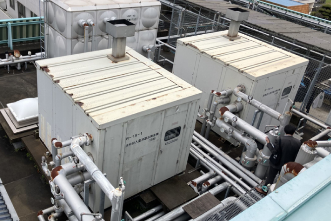 老朽化した吸収式冷温水機と給湯ボイラを、電気で稼働するヒートポンプチラーに更新。